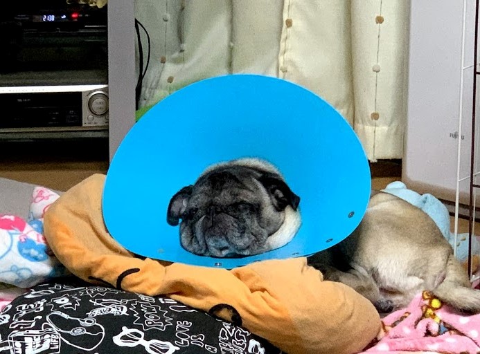 リキの手術は、耳とお腹の下。耳を足でかかないように、お腹を舐めない(これは大丈夫でしょう)ようにと、お腹の抜糸までは、ネッカーをつけておくように言われています。